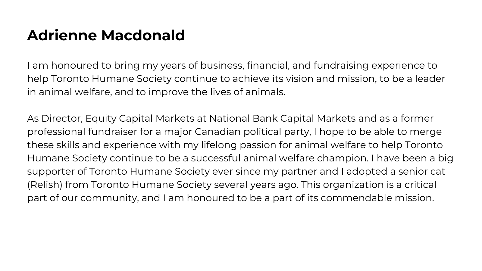 The Animal Welfare Committee is a standing Committee of Toronto Humane Society’s Board of Directors, constituted for the purpose of ensuring active engagement of the Board in animal welfare matters, in keeping with the objects of our organization.