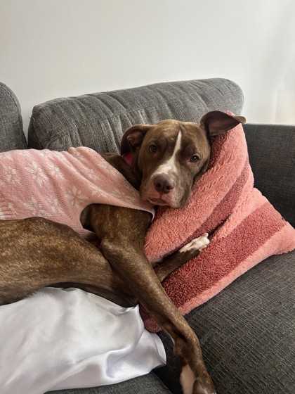 I adore company and thrive on being close to my humans. In my foster home, I've even made a good friend, Peter the kitty cat! When we have the couch to ourselves, she'll happily share it with me.