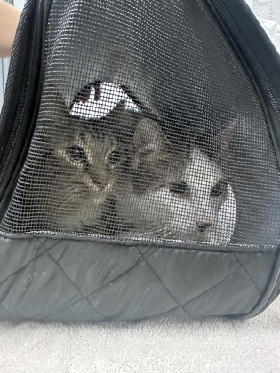 Both cats are sensitive to sudden noises and may retreat when their environment feels unpredictable, so a quiet home with patient adopters will allow them to settle at their own pace. Once they feel safe, their sweetness becomes unmistakable. They enjoy pets, they rely on each other for reassurance, and they show their affection in gentle, subtle ways.