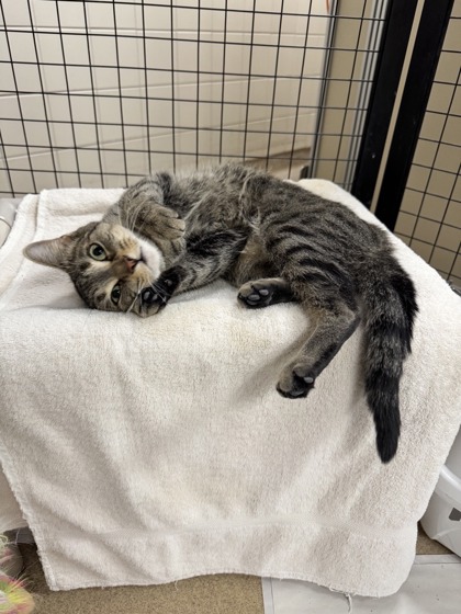 Noree is the kind of cat who likes to observe first and engage once she feels comfortable. She can often be found tucked into the cozy, hidden part of her bed, quietly watching the world go by. When given time and space, her curiosity shines through. A sprinkle of catnip or the invitation of a feather wand is usually enough to tempt her out to explore, stretch, and play. She enjoys interactive toys and will happily bat, chase, and investigate when the mood strikes.