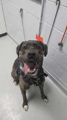 Gaia is has a strong pull on her lease when she's excited, so she'll do best with someone who can confidently handle her strength and continue reinforcing her good leash skills. Loud, sudden noises (like construction on the overpass next door) can startle her, but with reassurance she settles.