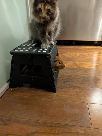 Like all guinea pigs, Guirlande will thrive in a spacious enclosure, a steady supply of hay, and a family that enjoys his lively commentary and daily antics. Guinea pigs are social animals, so they do best with plenty of interaction - Guirlande has become fast friends with the dog and cat in his foster home.